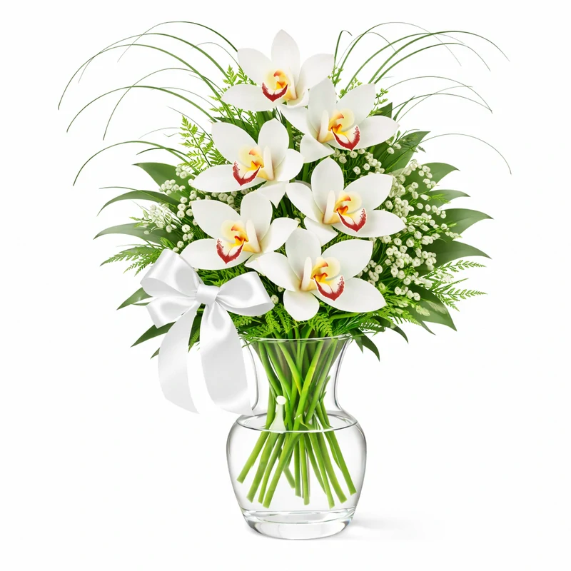 Kytice z orchidejí: cymbidium, gipsophila, zeleň