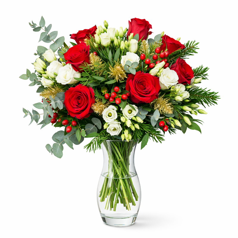 Kytice - rudé růže, eustoma, hipericum, eucalyptus, zeleň